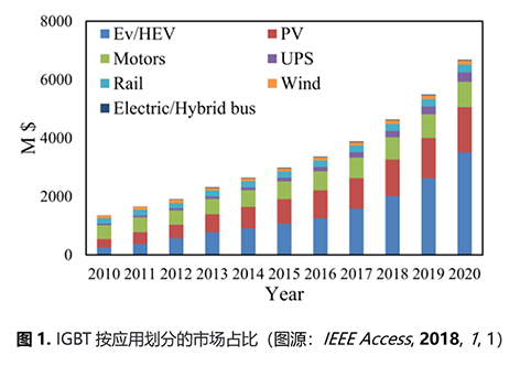 在现代社会,基于功率转化器的电力电子系统已广泛应用于工业、家庭控制和转换电能。电力电子系统的广泛使用为现代电动汽车、火车、自动化制造系统、发电等带来便利和更高的能源使用效率。绝缘栅双极晶体管(IGBT)在内的功率半导体器件以其优异的性能、低成本、高可靠性、低重量和尺寸等特点主导着功率转换器市场。预计IGBT市场将在2014年至2020年内蓬勃发展,到2020年全年收入在66亿美元左右,在纯电动与混合动力电动汽车(EV/HEV)、太阳能电池/光伏可再生能源(PV)、电机驱动(Motors)、轨道牵引(Rail)、不间断电源(UPS)、消费类电子产品等部分的复合收益年增长率达到10%(图1)。