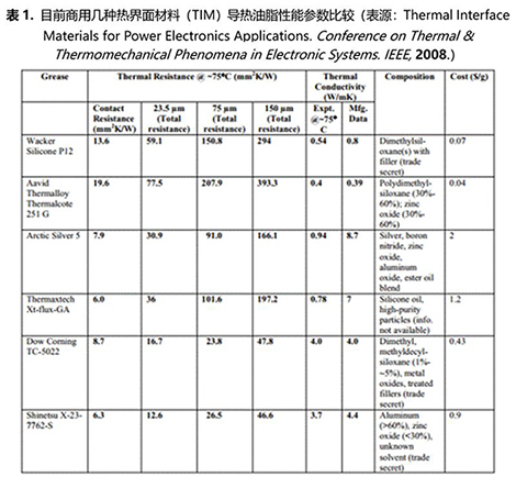 目前商业用的热界面材料如表1中的几种,其中热导率或者热阻率为其主要比较参数,可以看到目前大部分商业用导热油脂热阻都在6 mm²K/W以上,目前Thermaxtec公司h以硅油高纯热导颗粒作为导热材料具有6.0 mm²K/W的热阻率,但是其单位价格偏高1.2美元/g,而Shinestu公司用铝,氧化锌等热导纳米颗粒为主的导热硅油具有6.3 mm²K/W的热阻率,且价格相对较低0.9美元/g。因此发展低热阻的高效TIM也是目前最具有商业应用价值的方向之一。