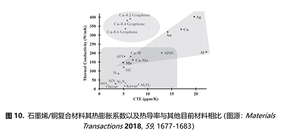 高功率IGBT的稳定性、寿命以及安全性都是发展新复合材料的基本要求,在IGBT长期使用中,温度升高会引起材料的热膨胀,若各层材料之间物性不匹配,则会导致严重的分层或损坏。石墨烯可用于调节材料热膨胀系数。为了消除材料之间热膨胀系数差异(Coefficient of Thermal Expansion: CTM),台湾国立清华大学纳米工程与微系统研究所开发了一种石墨烯/铜的复合材料,将球磨后得到的纳米石墨烯薄片进行电镀铜的工艺操作,得到石墨烯/Cu的复合粉体,保证其片状结构,再将其与纯铜进行复合挤出成型,得到具有低CTM的导热石墨烯/铜复合产物,其CTM值在0.2%石墨烯掺入下仅有5.3 ppm/K,且并未影响其复合材料的热导率(其热导率仍然具有390W/mK),因此能够大大提高IGBT模块的使用寿命。(Materials Transactions 2018, 59, 1677-1683)