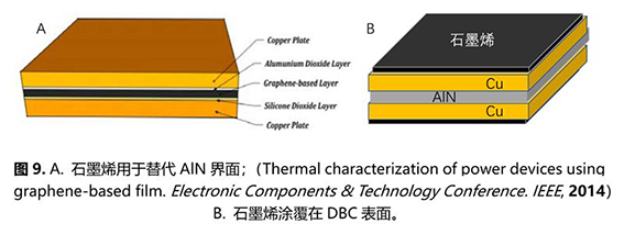 正如本文上述,DBC覆铜板在整个IGBT的散热中扮演着非常重要的角色,不仅有利于热点的热效应扩散以及热传递,也有利于IGBT结构的稳定,因此提高DBC层的热导或降低其热阻具有重要的意义。有报道利用石墨烯增加到原有DBC层中间形成过渡层。(Thermal characterization of power devices using graphene-based film. Electronic Components & Technology Conference. IEEE, 2014.) GO抽膜后进行表面接枝改性与铜进行结合,制备出低热阻的DBC,相比于纯铜/纯铜界面的756 mm²K/W热阻与纯铜/石墨烯界面482 mm²K/W热阻,利用接枝改性能够降低热阻到98.7 mm²K/W。但是该文未考虑到DBC板在受热时的热膨胀系数匹配问题,一旦两者不匹配将会导致IGBT整体结构的破坏。在专利《CN201920319513.7 石墨烯基IPM模块的先进封装结构》中,将还原氧化石墨烯贴装到覆铜陶瓷基板的上铜层表面,同时在下覆铜陶瓷基板的上铜层表面用化学气相沉积法生长石墨烯薄膜得到石墨烯改性的DBC板,发挥其横向高导热能力,降低芯片工作时的最高温度,从而提升模块的使用寿命。