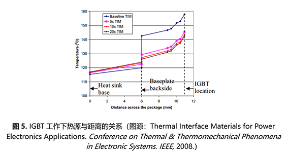 上述所说的热界面材料也是目前IGBT散热最广泛的研究方向之一。当热流从芯片传导到下层扰流柱都会经过热油脂(最常见的TIM),美国国家可再生能源实验室Sreekant Narumanchi等人通过理论计算,发现TIM在热阻为5 mm² K/W时(热导率200W/mK),TIM不再是热传导的瓶颈,而热阻较大时,则会阻碍IGBT的散热性能。(Conference on Thermal & Thermomechanical Phenomena in Electronic Systems. IEEE, 2008.)
