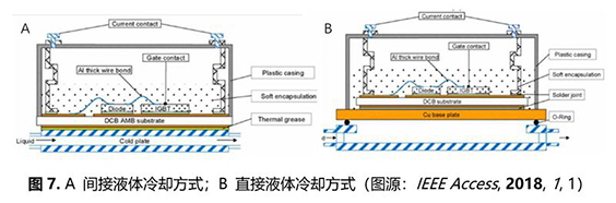 还有许多单相或两相的液体冷却解决方案,包括微通道散热器冷却方案、喷雾冷却方案、射流冲击冷却方案等,能够为IGBT提供非常高的传热系数和低的热阻。芯片损耗产生的大部分热量通过芯片下表面的方向从芯片底部散发到散热器。在这样的散热路径中,绝缘基板和热脂的热阻相对较大。由于热耗散受到模块接触部分和散热器的限制,即使模块本身的热阻很小,也很难实现小型化。因此,直接冷却结构已被广泛应用于代替传统的间接冷却方式。与图6A所示的间接冷却结构相比,直接冷却结构(图6B)抛弃了基板和附着的热润滑脂。一些论文发现IGBT的热性能通过直接冷却得到了明显改善。与传统的间接液体冷却方式相比,直接冷却方式可以减少高达30%的热阻。(IEEE Access, 2018, 1, 1)
