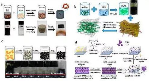 (a) 3D RGO/ PI复合材料的制备以及表征。(b) 3D RGO/聚苯胺混合气凝胶制备。(c) 3D RGO/聚吡咯气凝胶随GO/聚吡咯质量比不同,凝胶形态变化。(d)乳胶技术制备3D RGO/ NRL复合材料过程。