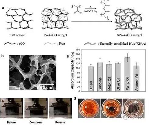(a)三维RGO/ XPAA气凝胶制备过程示意图. (b) 3D RGO/ XPAA气凝胶的SEM图。(c)对三维RGO/ XPAA气凝胶压力测试。(d) 制备气凝胶对汽油的吸附,整个过程为35s。