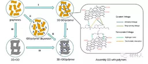 (i)以聚合物为交联剂进行3DGPCs合成(插图为聚乙烯亚胺与氧化石墨烯通过共价键或非共价相互作用构建的三维结构)。(ii)将聚合物与氧化石墨烯均匀分散,基于氧化石墨烯还原的自组装过程。(iii)将聚合物直接填充在合成的三维石墨烯结构中实现自组装。