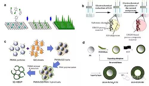 (a) 一步法电沉积制备三维石墨烯网络/PANI。(b) 两步电沉积制备RGO/聚苯胺电极。(c) 以PMMA颗粒作为模板制备RGO/聚苯胺空心球。(d) 利用层层自组装制备3D RGO/聚苯胺空心球。